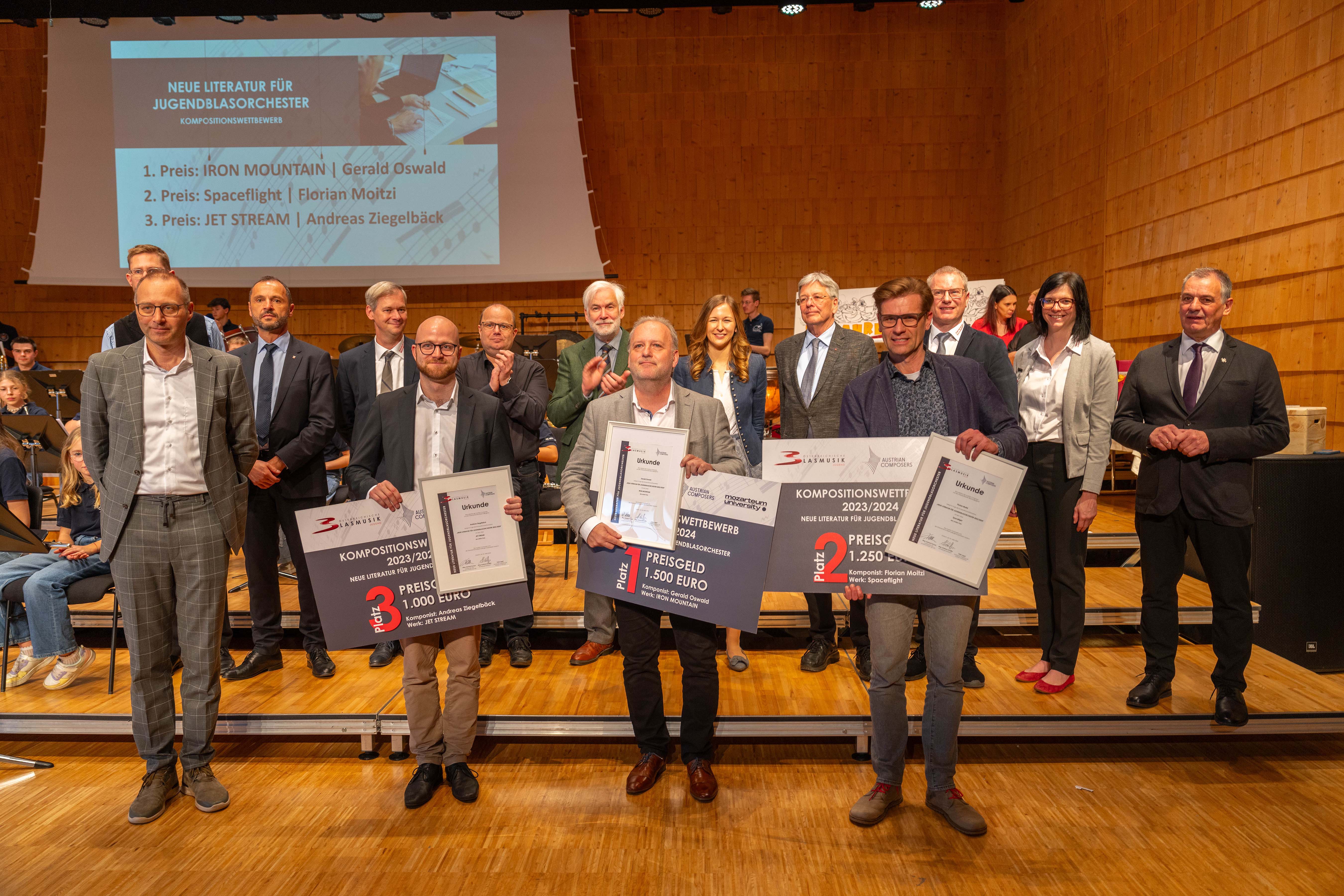 Aus über 47 Einreichungen beim Kompositionswettbewerb NEUE LITERATUR FÜR JUGENDBLASORCHESTER 2023/2024 konnten sich die Komponisten Florian Moitzi, Gerald Oswald und Andreas Ziegelbäck mit ihren für den Wettbewerb komponierten Stücken durchsetzen. Eine Vorjury ermittelte die elf besten Kompositionen, an denen die Komponisten anschließend in Workshops mit Jakob Gruchmann und Klemens Vereno & Franz Zaunschirm arbeiten konnten.